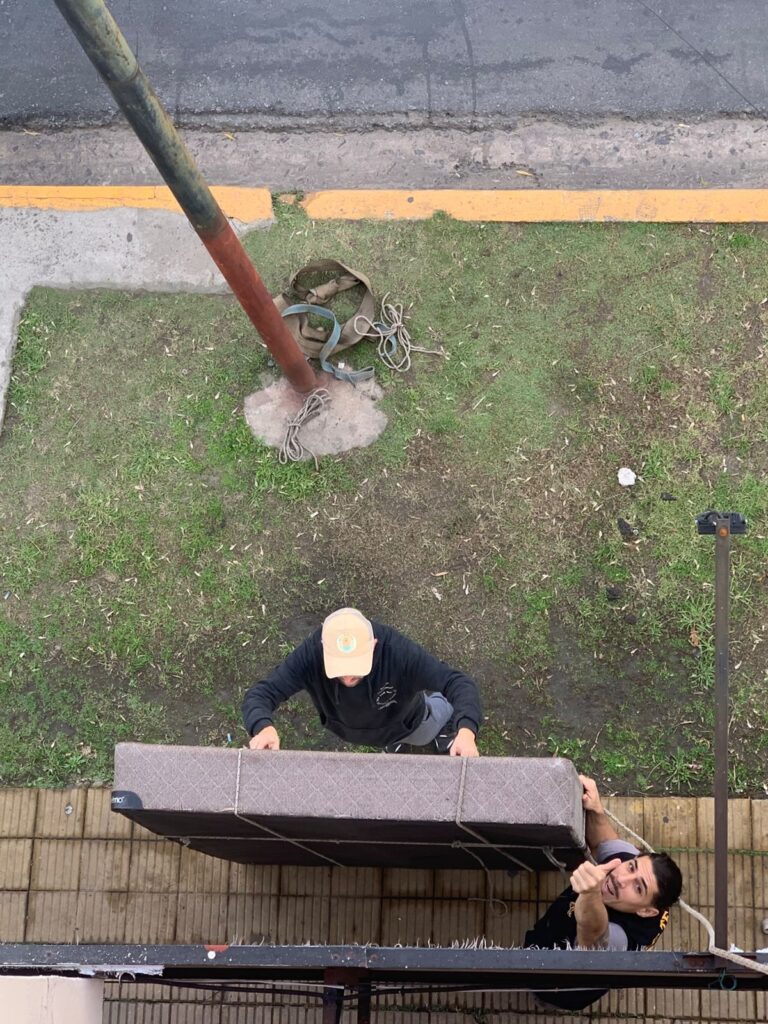 El ascenso o descenso del mueble se realiza utilizando sogas profesionales de 12 mm, preparadas para soportar cargas pesadas y trabajos en altura. Gracias a esta técnica, es posible subir sillones, sofás y muebles grandes incluso en pisos altos, resolviendo situaciones habituales donde muchos clientes consultan cuánto cuesta subir un sofá por la ventana o si es viable hacerlo sin romper nada.